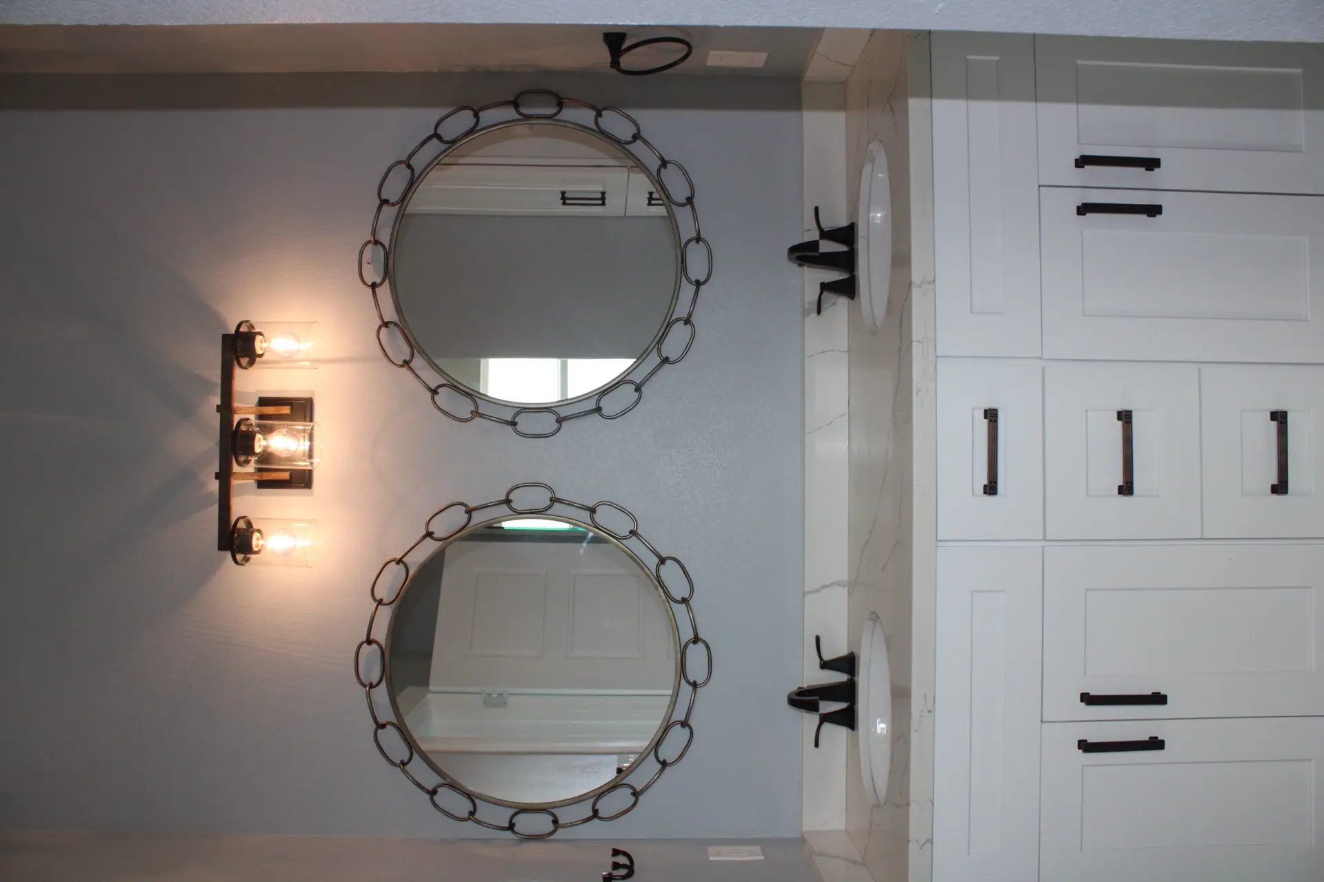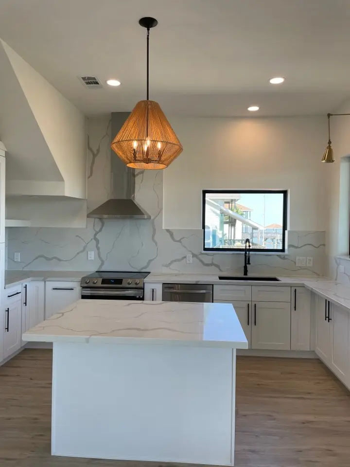 Inside, high ceilings amplify the sense of space and light throughout every room. The spacious bedrooms feature a wood-look accent wall that adds warmth and texture, while the bathrooms steal the show with a large glass walk-in shower clad in gray marble-look tile with a mosaic accent niche, and a freestanding soaking tub set on a patterned mosaic tile floor. Every detail has been carefully selected to balance bold coastal character with refined, resort-level finishes.