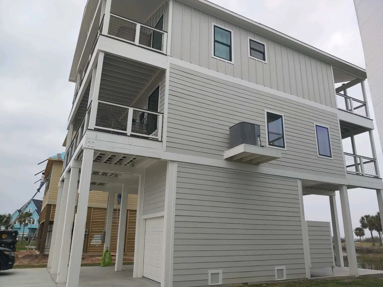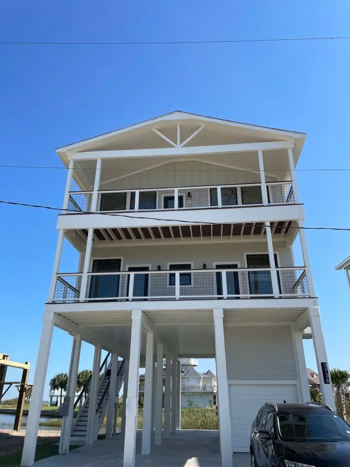 Striking teal and turquoise board-and-batten siding with crisp white trim makes this 2nd Street home impossible to miss. Two levels of covered porches with white railings frame the exterior, while the sandy lot and proximity to the beach set the stage for true Galveston Island living.